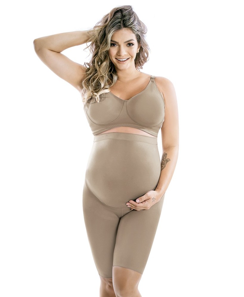 Cinta modeladora para gestante com pernas com comprimento até meia coxa e fundo